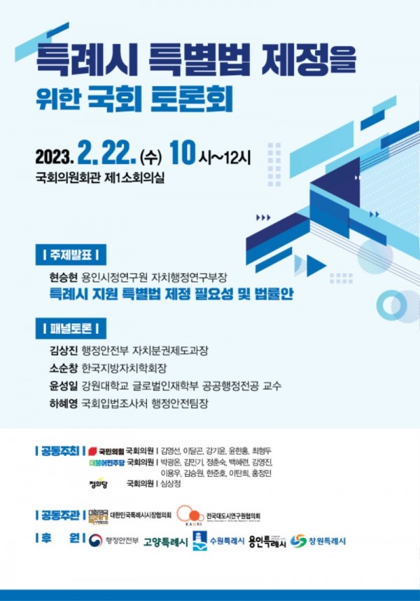 - 오는 22일 국회서…대한민국특례시시장협의회ㆍ국회의원 16명 등 한 자리에 모여 - ▲'특례시 특별법 제정을 위한 국회 토론회' 포스터(사진제공=용인시) '특례시 특별법' 제정 공론화를 위한 정책 토론회가 22일 열린다. 용인특례시(시장 이상일)는 22일 국회 의원회관 제1소회의실에서 '특례시 특별법 제정을 위한 국회 토론회'가 열린다고 21일 밝혔다. 지난 202…