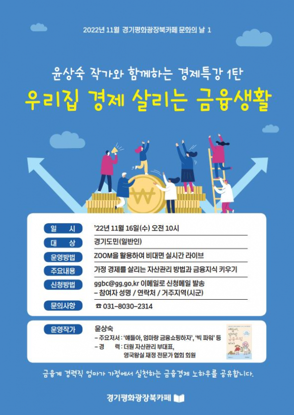 - 가정경제의 효율적 관리 방안 및 자녀 경제교육 주제로 강의 - ‘얘들아, 엄마랑 금융쇼핑하자’, ‘빅파워’ 등 저자 윤상숙 작가 초청 ○ 코로나19 상황 고려해 온라인 비대면 실시간 강연으로 진행 ▲'11월 문화의 날’ 행사(사진제공=경기도) 경기도는 ‘경기평화광장 북카페 11월 문화의 날 프로그램’으로 「가정경제의 효율적인 관리 방안과 자녀 경제교육」을 주제로 한 독서 강연을 마련했다고 1…