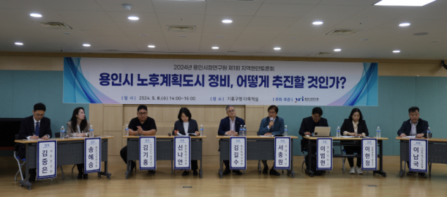 ▲용인시정연구원 2024년 제1회 지역현안토론회 개최(사진제공=용인시정연구원) 용인시정연구원(원장: 이상대)은 5월 8일(수) 기흥구청 다목적실에서 ‘용인시 노후계획도시 정비, 어떻게 추진할 것인가?..