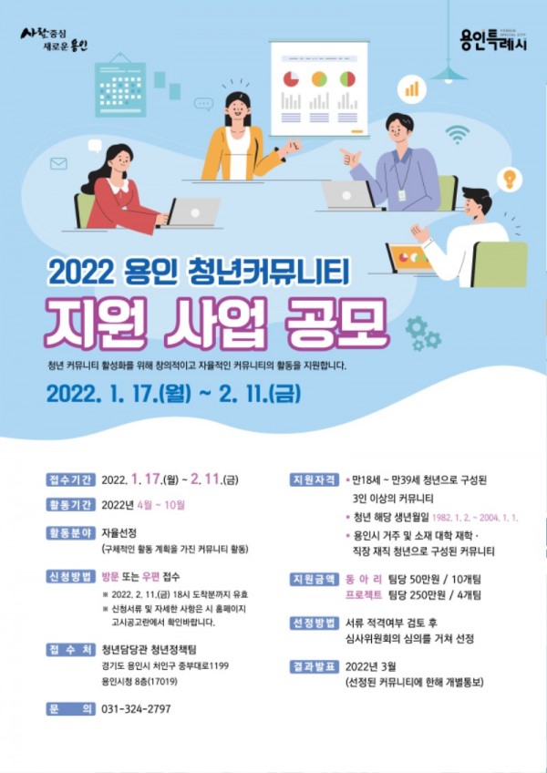 용인 청년 커뮤니티 지원 홍보 포스터(사진제공=용인시) 용인시는 ‘2022년 청년 커뮤니티(동아리) 지원사업에 참여할 14개팀을 모집한다고 17일 밝혔다. 청년들의 사회참여를 활성화하고 활동적인 청년 문화를 조성하기 위해 청년들이 창의적이고 자율적으로 다양한 커뮤니티(동아리)를 운영할 수 있도록 지원하는 것이다. 대상은 관내에 거주하고 있거나 생활하고 있는 만 18세 이상 만 39세 이하 청년 3명 이상으로 구성된 모임이다. &nb…