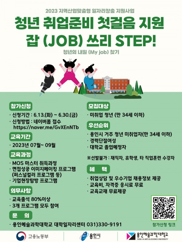 - 30일까지 접수…‘기업탐방+면접 이미지메이킹+MOS마스터’풀코스 7월부터 교육- ▲용인특례시가 30일까지 취업 준비 청년을 지원하는 ‘2023년 지역?산업맞춤형 일자리창출 지원사업(Job 3 Step)에 참여할 미취업 청년 30명을 모집한다(사진제공=용인시) 용인특례시(시장 이상일)가 30일까지 취업 준비 청년을 지원하는 ‘2023년 지역‧산업맞춤형 일자리창출 지원사업(Job 3 Step)에 참여할 미취업 청년 30명을 모집한다고 16일 밝혔다. 이 사업은 시가 …