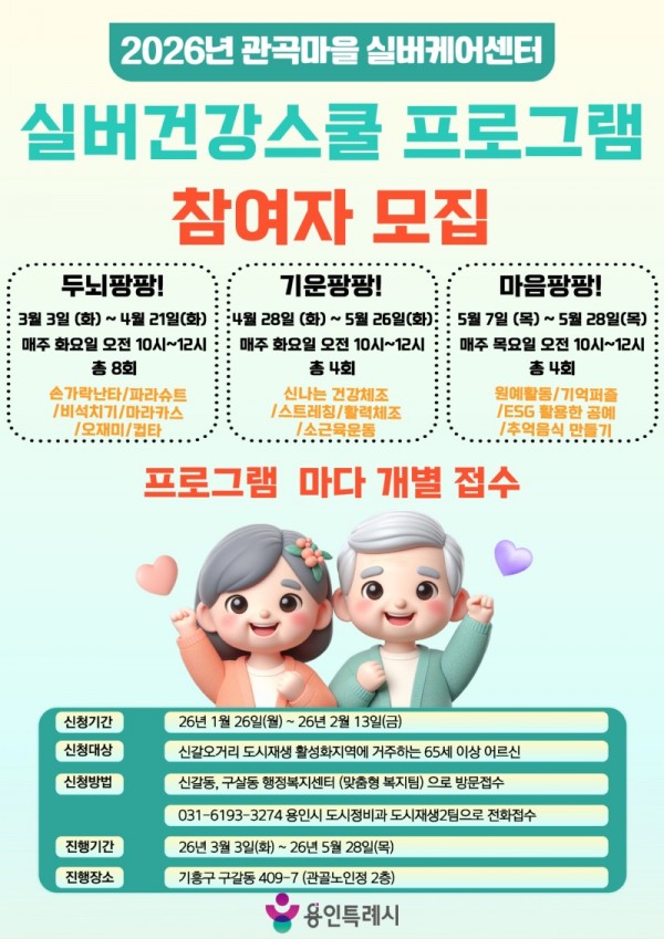 ▲용인특례시 실버건강스쿨 프로그램 참가자 모집 홍보물(사진제공=용인시) 용인특례시(시장 이상일)는 ‘관곡마을 실버케어센터 실버건강 프로그램’ 참가자를 13일까지 모집한다. 참여 대상은 신갈오거리 도시재생활성화지역에 거주하는 65세 이상 어르신이며, 실버건강스쿨과 실버건강체조 프로그램에 각각 15명을 선착순 모집한다. 프로그램은 신갈오거리지역 도시재생활성화사업 일환으로 리모델링한 관곡마을 실버케어센터(기흥구 신구로22번길 7-24)에서 진행한다. 참여 신청은 도시정비과 도시재생2팀(031-6193-3274…